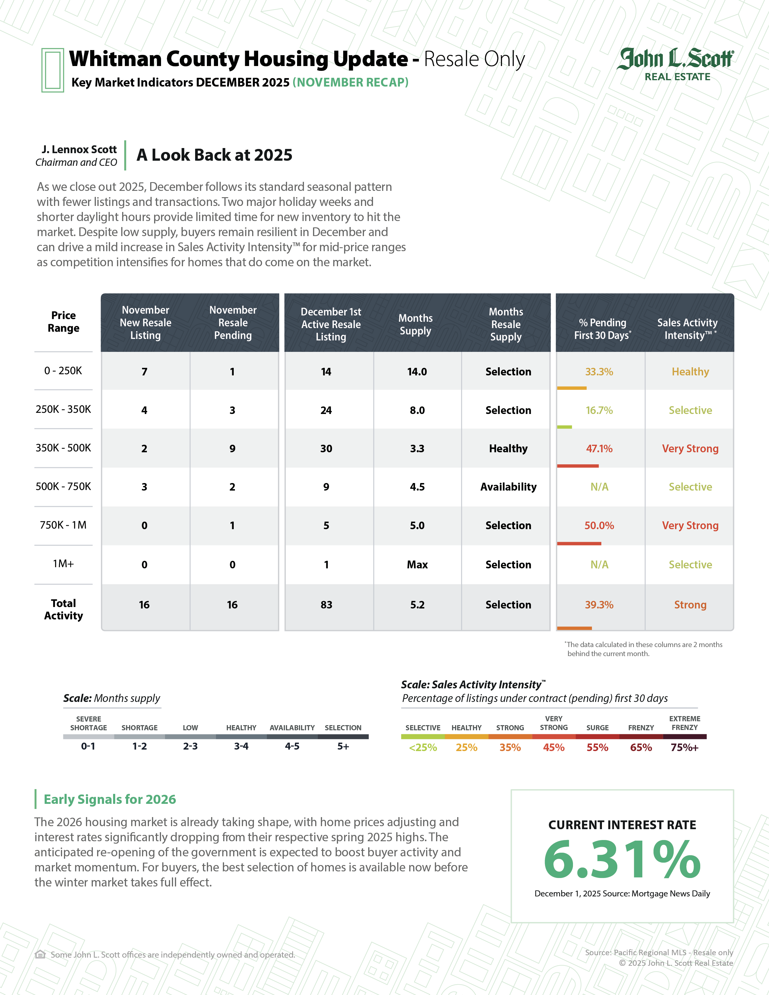 As we close out 2025, December follows its standard seasonal pattern with fewer listings and transactions. Two major holiday weeks and shorter daylight hours provide limited time for new inventory to hit the market. Despite low supply, buyers remain resilient in December and can drive a mild increase in Sales Activity Intensity™ for mid-price ranges as competition intensifies for homes that do come on the market.